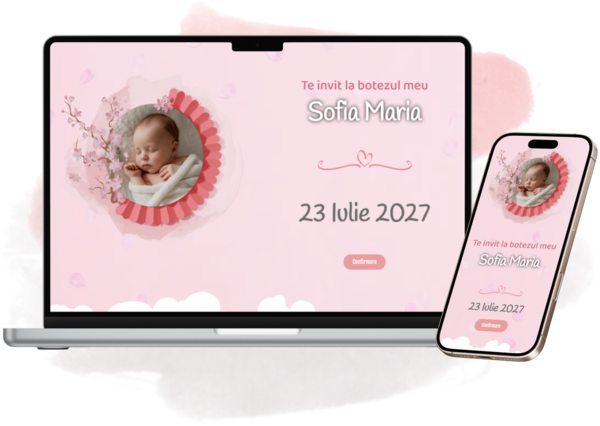 Un website cu toate informațiile evenimentului tău, cu formular de confirmări RSVP inclus.